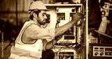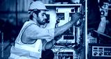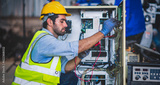 Electrical engineer work tester measuring voltage and current of power electric line in electrical cabinet control for industrial production.