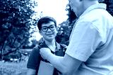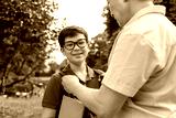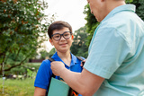 asian old father goes to school with son and carry books, korean boy with backpack and glasses goes to school