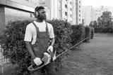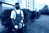 garden worker in uniform cuts bushes, african american man in goggles and headphones works in the garden