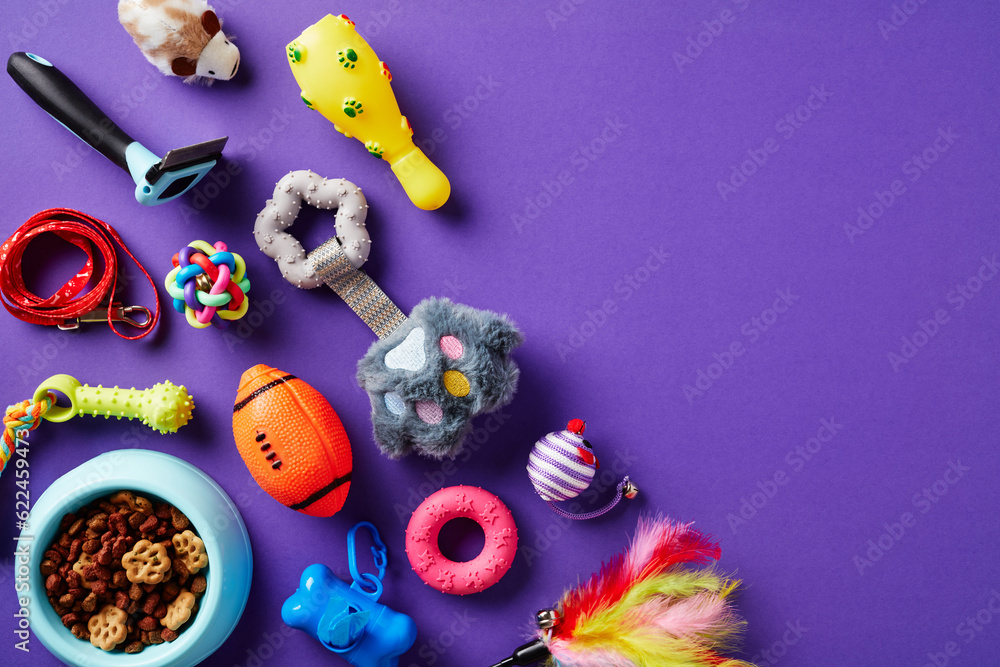Pet accessories and toys on purple background. Pet shop banner design. Flat lay, top view.