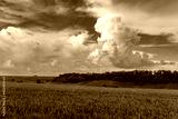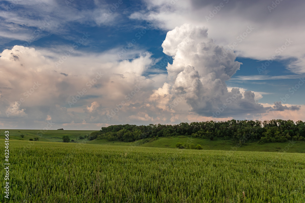 Green wheat field landscape with epic cloudy sky. Spring barley growing with trees in background. Agriculture in Ukraine