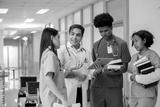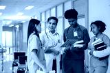 Teacher doctor man and group of medical student standing looking work in tablet. education and learning medical concept.