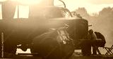 German Military Ammunition. German Vehicle Truck Opel Blitz And German Infantry Cart Or Handcart Infanteriekarren If8 Of World War Ww Ii. Black And White . German World War Ii Automotive.
