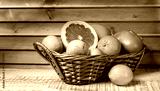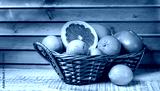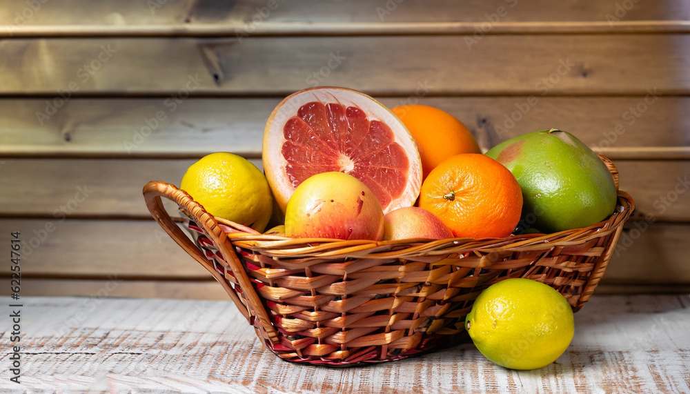 Colourful wicker basket of assorted tropical fruit with a lime, grapefruit, oranges and an apple in a country kitchen on wooden boards