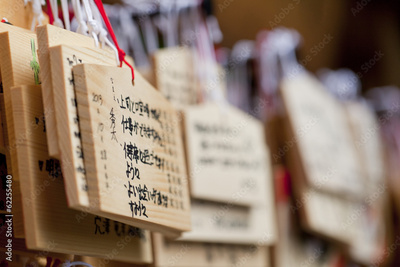 Wooden prayer tablets hanging inside a Japanese temple in Tokyo