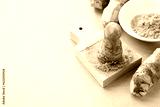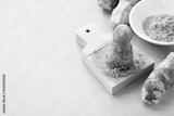 grated fresh wasabi and wasabi roots on a kitchen slab.