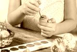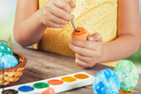 Girl paints Easter egg in orange color