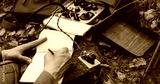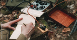 Russian Soviet Infantry Red Army Soldier In World War II using Russian Soviet Portable Radio Transceiver In Trench Entrenchment In Spring Autumn Forest. . Headphones And Telegraph Key. Close Up Hands,