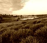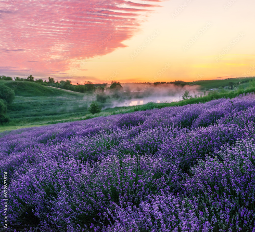 Lavender field and wonderful beautiful cloudy sky at sunrise. Beautiful nature background.