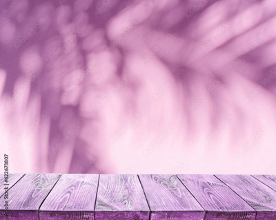 Blurred shadow of tropical palm leaves on pink wall and old planked table top in the foreground. Summer concept.