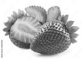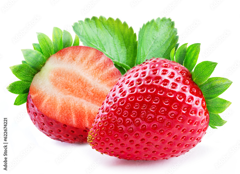 Ripe perfect strawberry and cross cut of strawberry with leaf isolated on white background.