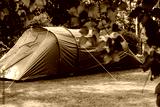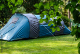 Campground in the shade of green trees on a sunny summer day. Extreme sports and outdoor recreation. tourist tent