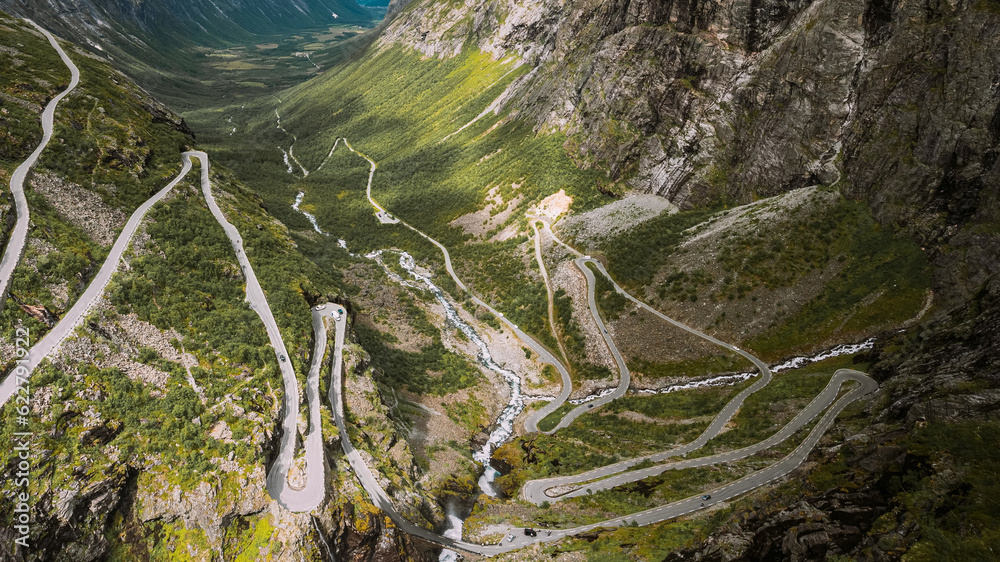Trollstigen, Andalsnes, Norway. Cars Goes On Serpentine Mountain Road Trollstigen. Famous Norwegian Landmark And Popular Destination. Norwegian County Road 63 In Summer Day. .