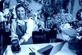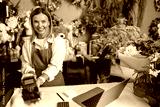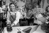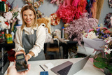 Smiling florist holding POS terminal in floral shop and looking at camera. High quality photo