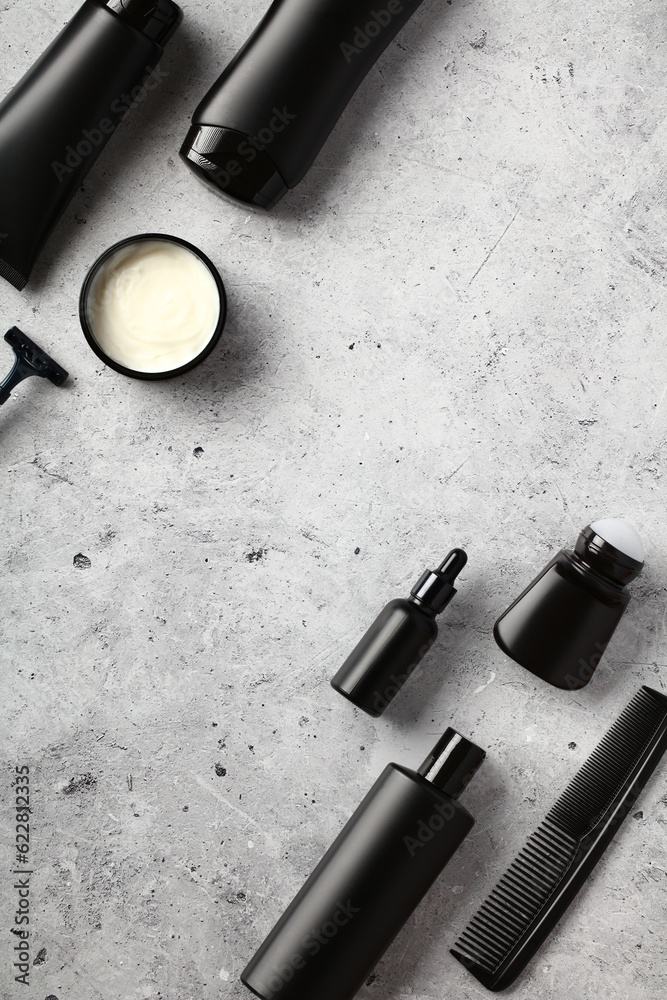 Men's skin care products on stone table in bathroom. Luxury black packaging design. Flat lay, top view.