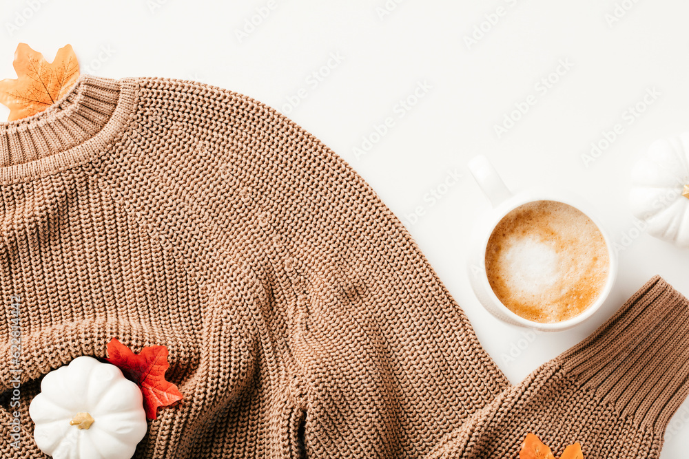 Autumn fall still life with knitted sweater, coffee mug, decorative pumpkins, maple leaves