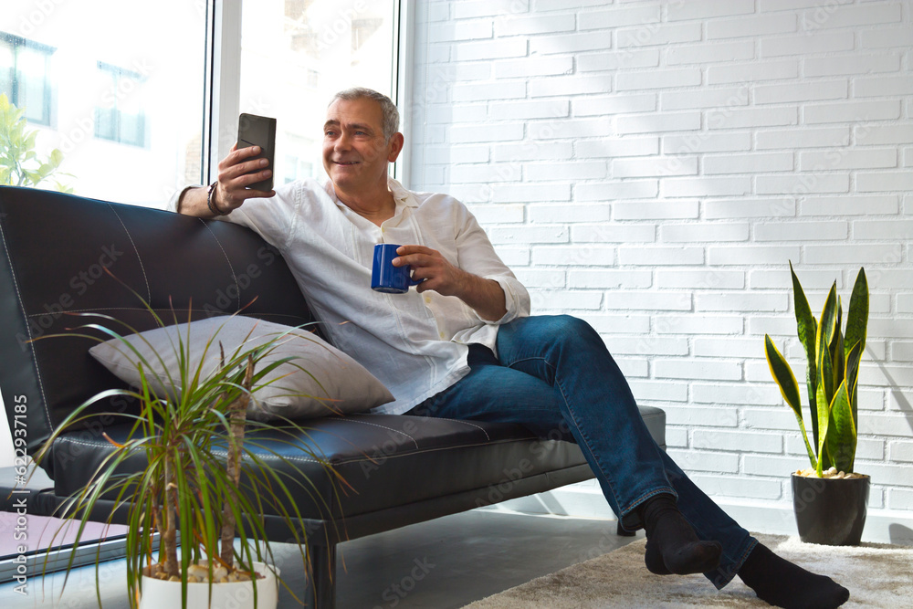 mature man relaxing on sofa with coffee and mobile phone in apartment