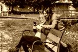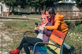 couple of homosexual girls with mobile phone on park bench lgtbi