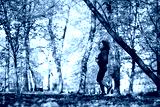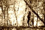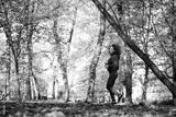 Wide shot of caucasian woman jogging in the park in the autumn