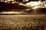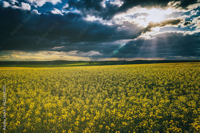 The sun breaking through storm clouds in a flowering rapeseed field. Aesthetics of vintage film.