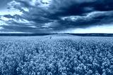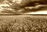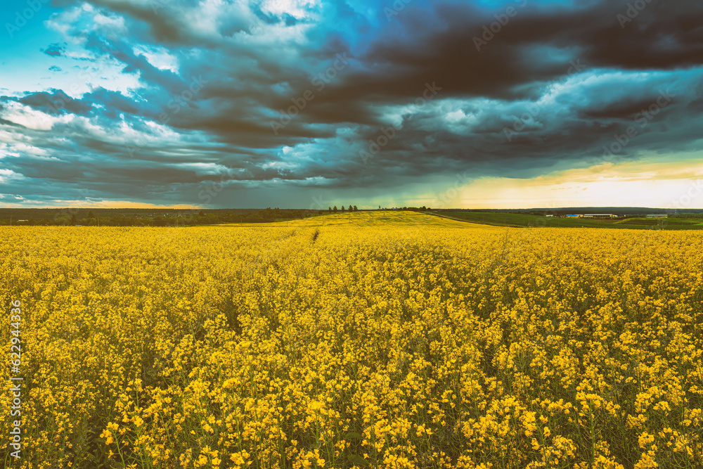 An approaching thunderstorm in a flowering rapeseed field. Aesthetics of vintage film.
