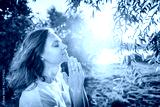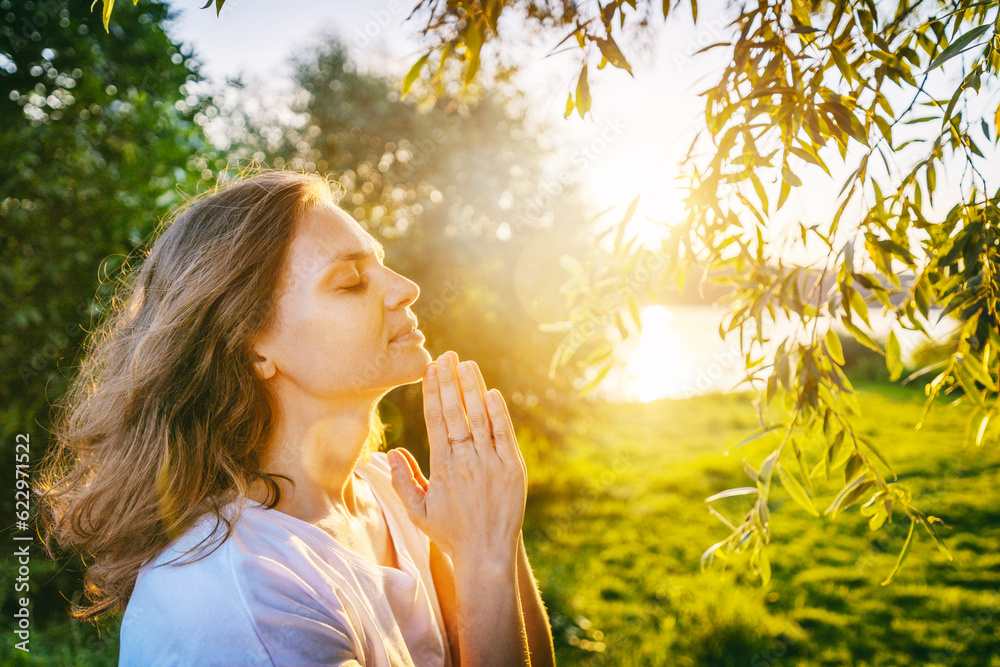 Young woman praying with closed eyes on the river bank at sunset. Religion and spirituality outdoor concept