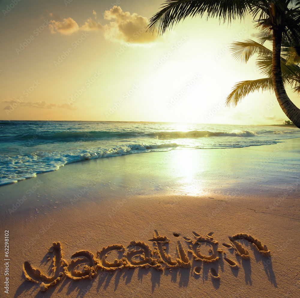 Art Summer vacation concept--vacation text on a sandy ocean beac