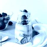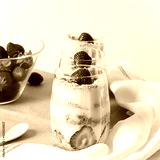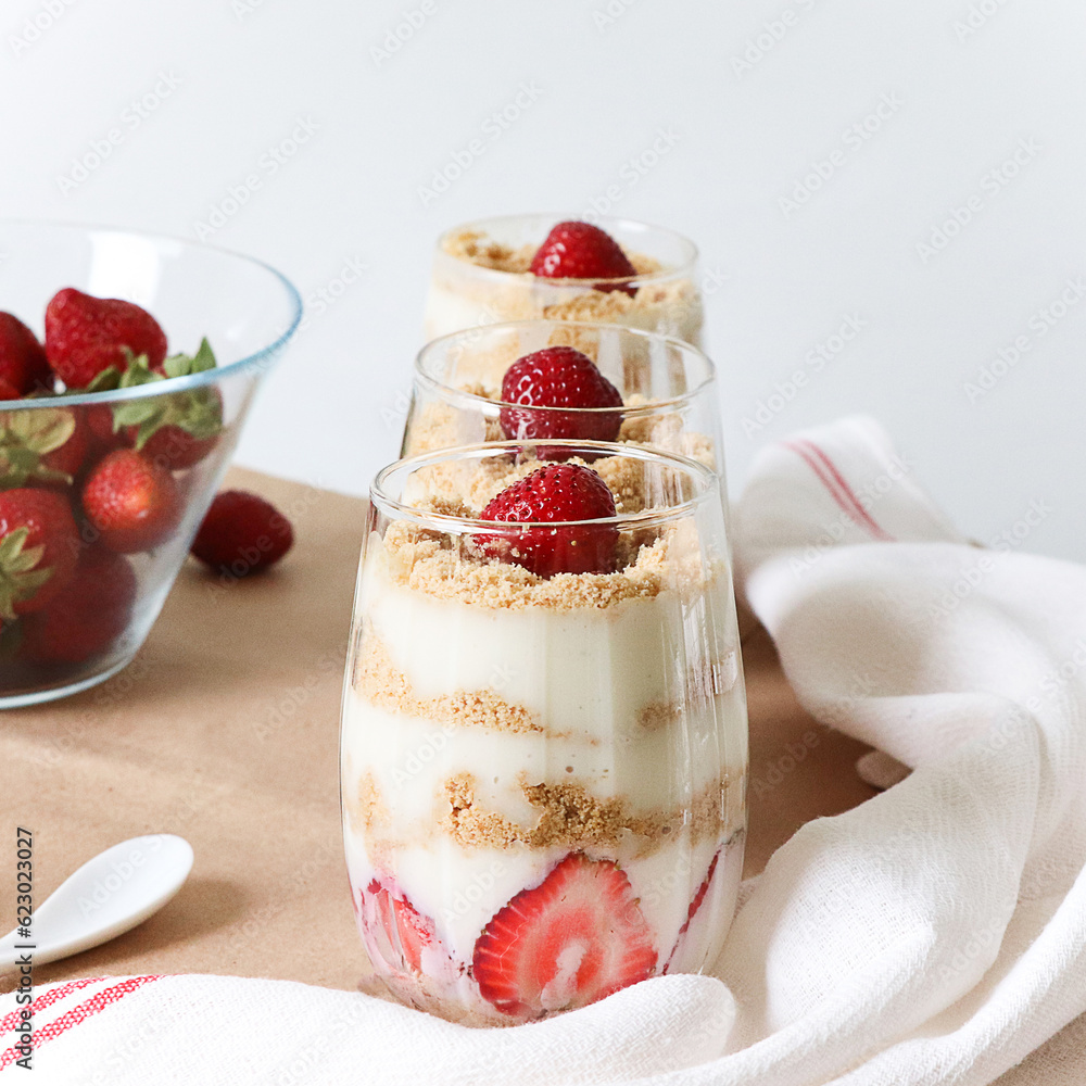Three cups of magnolia desert with strawberry topping on the table