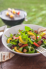 Fresh healthy herb salad on a picnic table
