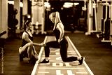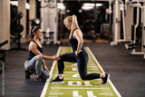 A happy female personal instructor is helping sportswoman with lunges in a gym.