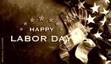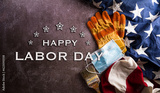 Happy Labor day concept during coronavirus disease (Covid-19). American flag with different construction tools and medical mask on dark stone background.