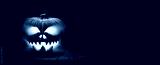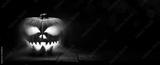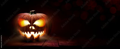 The spooky haunted evil glowing eyes of Jack O' Lanterns, halloween pumpkin, on the left of a wooden bench on a scary halloween night