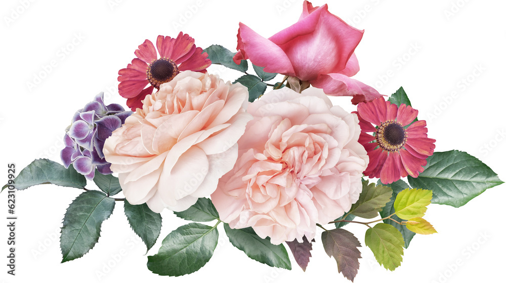 Roses isolated on a transparent background. Png file. Floral arrangement, bouquet of garden flowers. Can be used for invitations, greeting, wedding card.