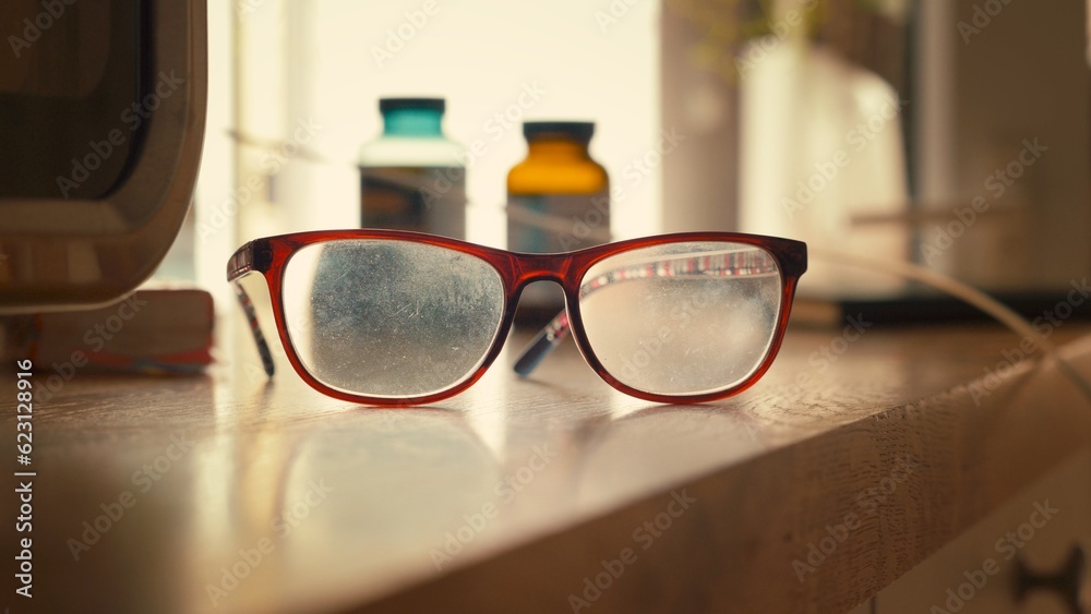 Close up of Red Glasses on Countertop With Shallow Depth of Field and Bright Background
