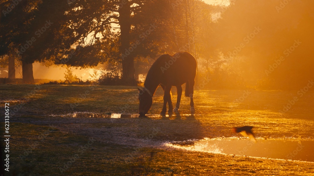 Horse Drinking Water Silhouetted in Bright Orange Sun Rays