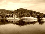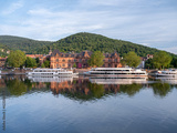 Historic Stadthalle (city hall) building along the Neckar River in Heidelberg, Germany