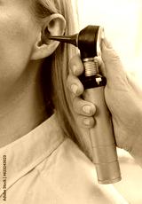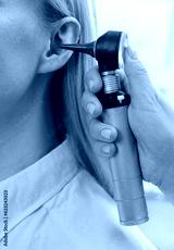 Woman patient having check-up of hearing at doctor otolaryngologist. Hearing exam for female. Otolaryngologist doctor checking mature woman's ear using otoscope or auriscope at medical clinic