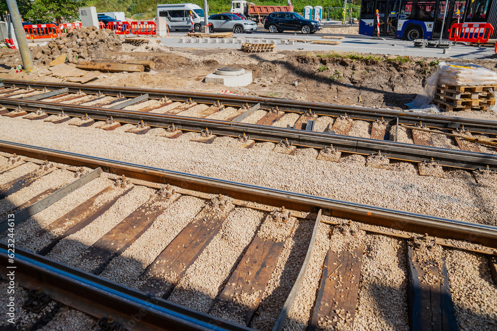 Exposed tram tracks in construction site in Riga, Latvia, Europe