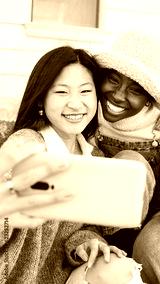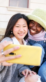 Vertical Smiling selfie of Two cheerful female friends having fun. Interracial Couple taking picture with smart mobile phone. Happy people enjoying vacations only for girls. High quality photo