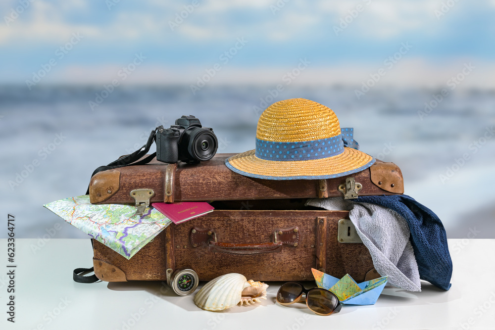 Vintage suitcase packed with travel accessories for beach vacation like straw hat, photo camera, towels, passport, map and sunglasses, blurry ocean in the Background, copy space