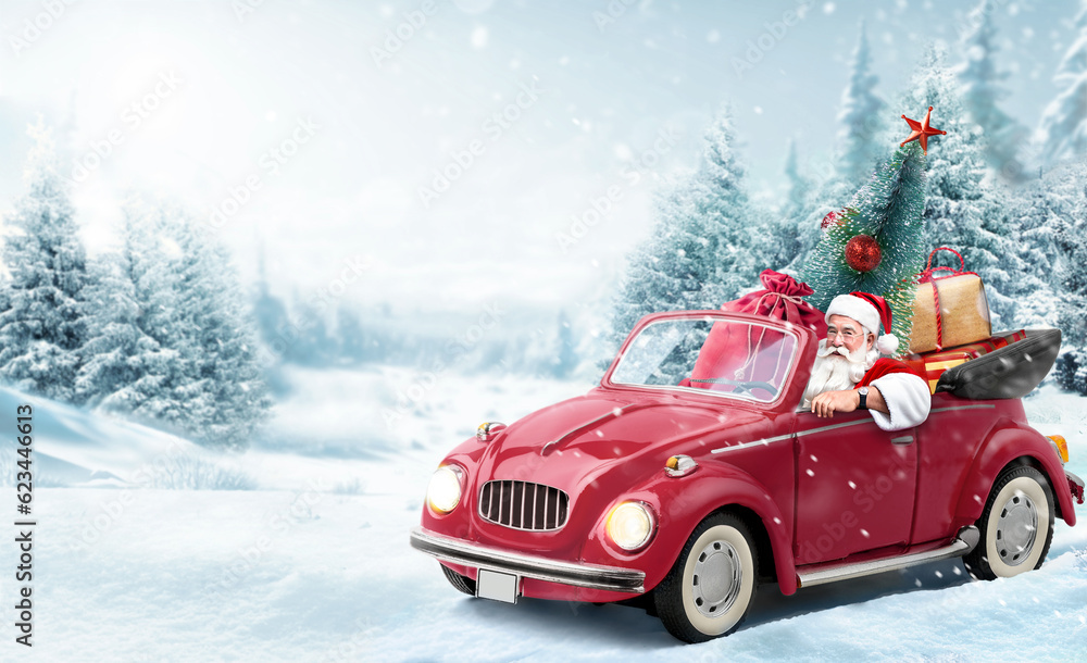 Santa Claus in Red car delivering christmas tree and gifts at snowy background. Christmas card