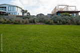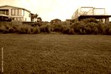 Background texture of healthy green grass lawn with some new residential houses at the back, one under construction. Concept of new suburb, real estate development, self build home and housing market.