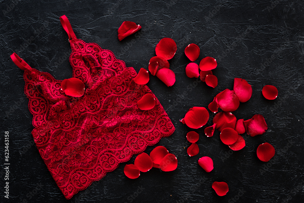 Elegant red lace lingerie bikini panties with rose petals, top view