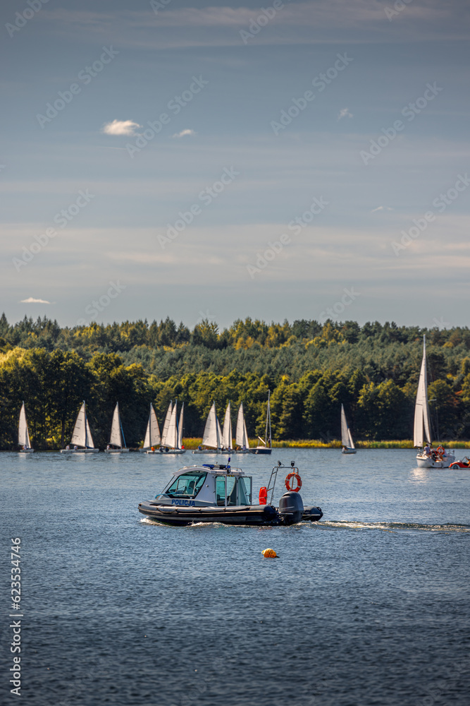 Police motorboat on Lake Ukiel in Olsztyn. Sailboats by the shoreline in the distance.