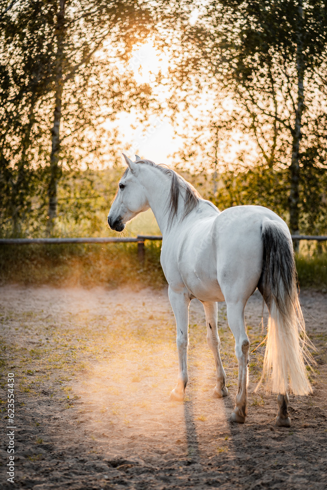 Majestic white grey spanish andalusian iberian horse stallion on golden hour.