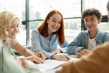 Smiling female teacher having lesson, studying, learning language with school children sitting in classroom or library. Education concept