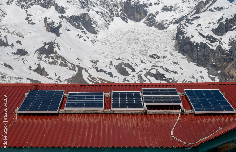 Group of Solar cells on the hotel roof in the area of Annapurna base camp, Nepal.