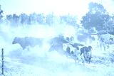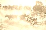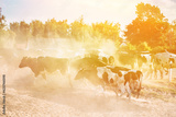 Sun Shining With Sun Rays Above Herd Of Cows Crossing In Rural Meadow Countryside In Dusty Road. Scenic View Bright Sunbeams. Cattle.