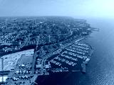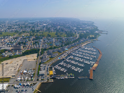 Borden Light Marina aerial view on the Taunton River with Fall River modern city skyline at the back in Fall River, Massachusetts MA, USA.