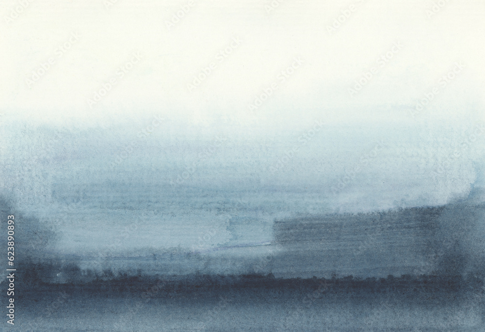 Ink watercolor smoke flow stain blot on wet paper texture background.. Blue color abstract landscape.